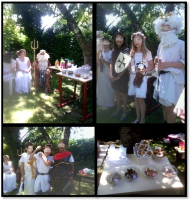 Le « banquet des Dieux », en plus d’être un moment de partage avant la séparation des vacances d’été, est une activité en prolongement à l’étude de l’Antiquité en classe de 6ème. Aucun anachronisme possible lors du banquet: pas de chocolat ni de soda mais des fruits méditerranéens (figues, dattes, abricots…) et du jus de raisin ! Les héros de ce banquet: Poséidon et son trident, Apollon et sa lyre, Athéna et sa chouette, sans oublier Jason, Ulysse et Achille !