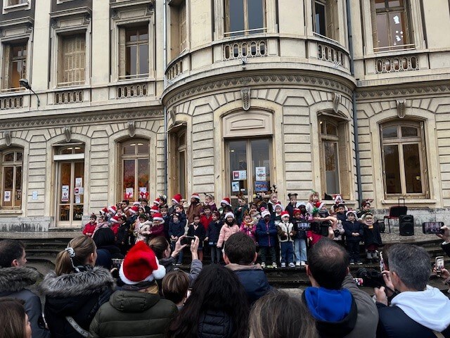 Les élèves ont invité leurs parents à partager un moment festif en musique, avant de leur souhaiter de très belles vacances de fin d’année. Les parents se sont d’abord retrouvés sur la cour de la maternelle, autour d’un café, pendant que les enfants se préparaient en coulisses avec quelques accessoires sur le thème de Noël.