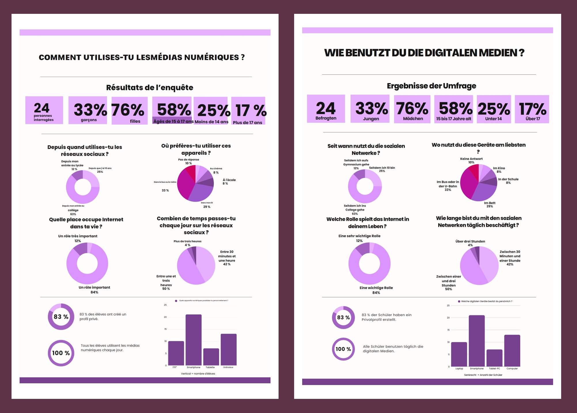 Il ressort du sondage effectué auprès des vingt-quatre germanistes du collège et du lycée que les réseaux sociaux occupent une place prépondérante dans la vie des élèves interrogés et, pour un quart d’entre eux, dès le début de l’adolescence. Par ailleurs, la moitié d’entre eux passe une à trois heures sur ces réseaux sociaux. Bien que leur utilisation permette de communiquer, partager ou encore de découvrir des contenus enrichissants, ils ne restent pas moins exposés à une consommation excessive. C’est la raison pour laquelle, nous devons, pour en tirer tous les bénéfices, utiliser les réseaux sociaux de manière réfléchie, accompagnés de nos parents et de différents professeurs.
